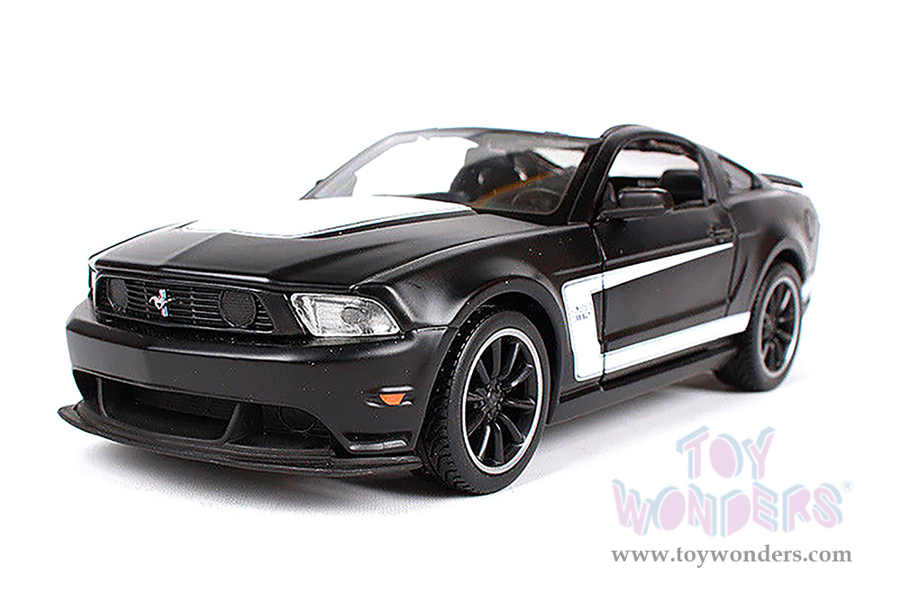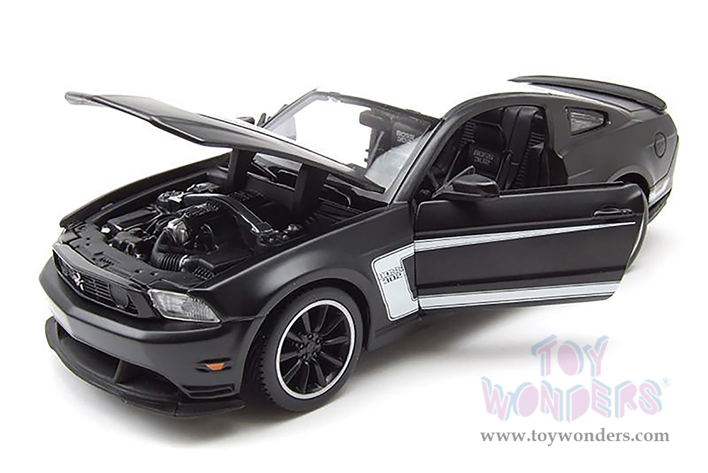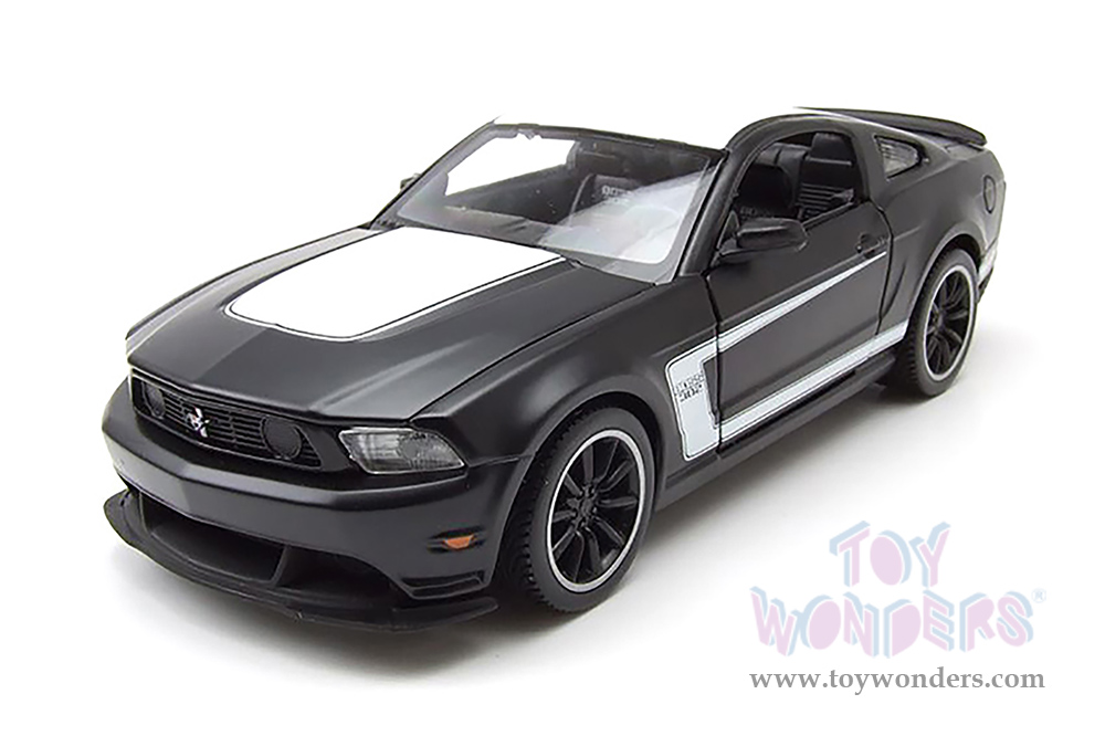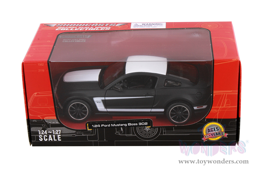 38269BK Showcasts® Collectibles - 2012 Ford Mustang Boss 302 Hardtop. 1:24 scale diecast collectible model car. This Ford Mustang Boss 302 is a 7.75"L x 3"W x 2.25"H diecast metal with freewheeling, openable doors and hood. Item 38269BK is in black. Individually packed in a window box. Box size: 9.25"Lx 4.5"Wx 4.125"H.
