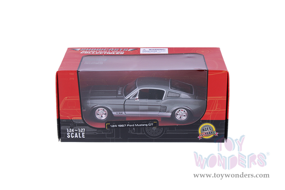 38260GY Showcasts® Collectibles - 1967 Ford Mustang GT-500 Hardtop. 1:24 scale diecast collectible model car. This Ford GT 500 is a 7.5"L x 3"W x 2"H long diecast metal car with openable doors and hood. Freewheeling. Item 38260GY is in gray. Individually packed in a window box. Box size: 9.25"Lx 4.5"Wx 4.125"H.