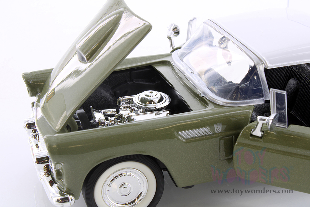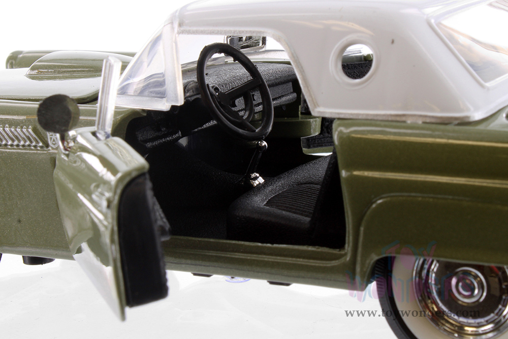 77312GN Showcasts® Collectibles - 1956 Ford Thunderbird Closed Convertible. 1:24 scale diecast collectible model car. This Ford Thunderbird measures 7.25"L x 3"W x 2"H diecast classic car with openable doors, hood, trunk, steerable front wheels. 77312GN is in green with white roof. Individually packed in a window box. Box size: 9.75"Lx 4.5"Wx 4"H.