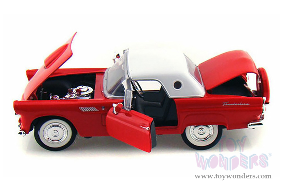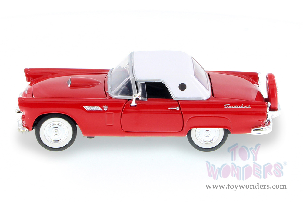 77312R Showcasts® Collectibles - 1956 Ford Thunderbird Closed Convertible. 1:24 scale diecast collectible model car. This Ford Thunderbird measures 7.25"L x 3"W x 2"H diecast classic car with openable doors, hood, trunk, steerable front wheels. 77312R is in red with white roof. Individually packed in a window box. Box size: 9.75"Lx 4.5"Wx 4"H.