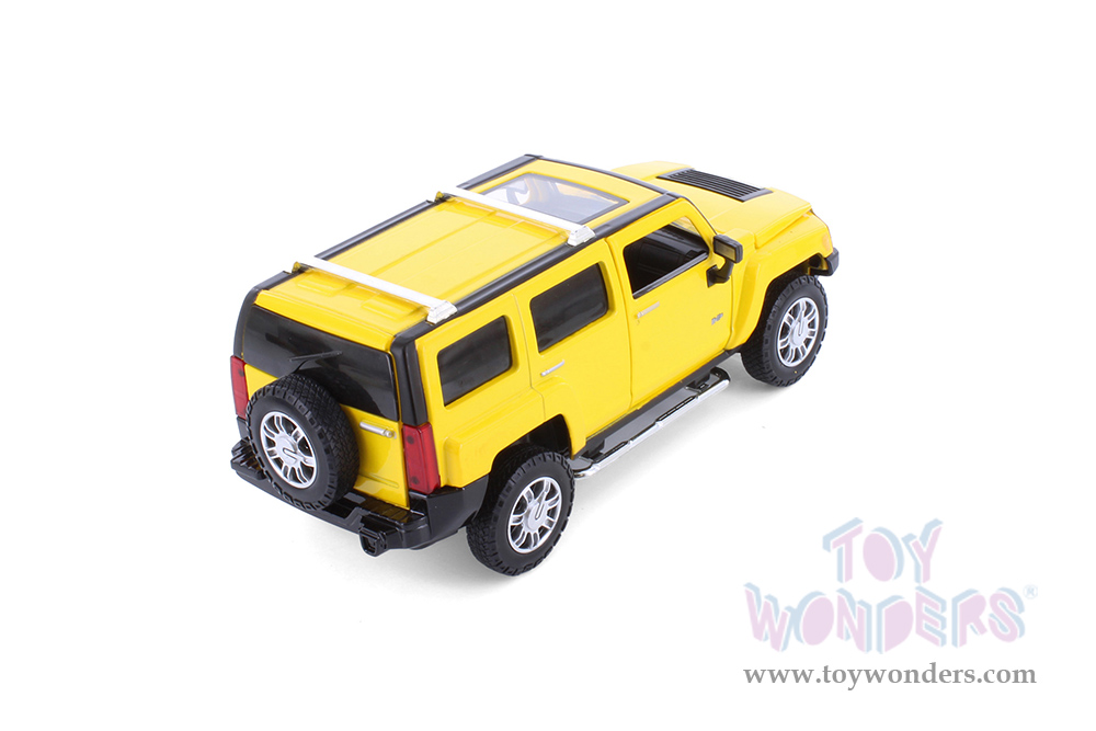 68240YL Showcasts® Collectibles - Hummer H3. 1:24 scale diecast collectible model car. This Hummer is a 7.75"L x 3.25"W x 3"H die-cast metal car with freewheeling, openable doors, hood and rear gate. Item 68240YL is in yellow. Individually packed in a window box. Box size: 9.75"Lx 4.25"Wx 4"H.