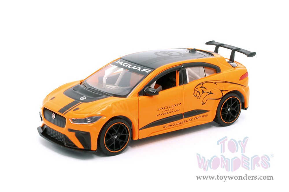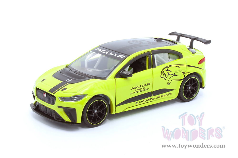 TM012010 Showcasts Collectibles - Jaguar I-Pace eTrophy. 1:36 scale diecast collectible model car. This Jaguar is a 5.25"L x 2.25"W x 1.75"H diecast metal car with openable doors and pullback action. This Jaguar I-Pace is manufactured by Tayumo for Showcasts Collectibles. 12 pcs per display box and in assorted colors.
