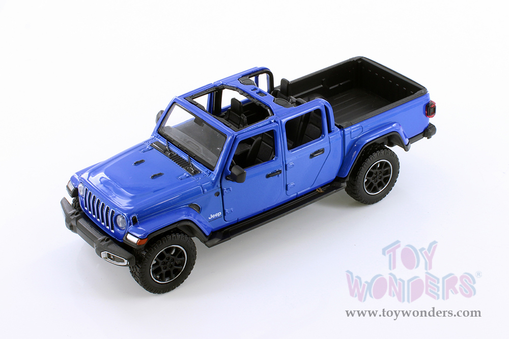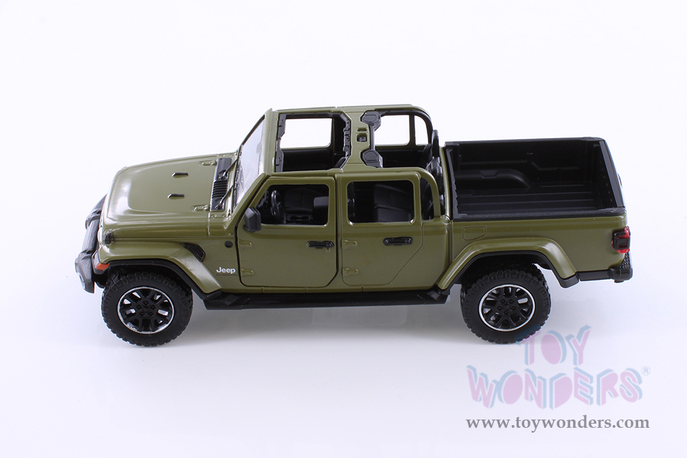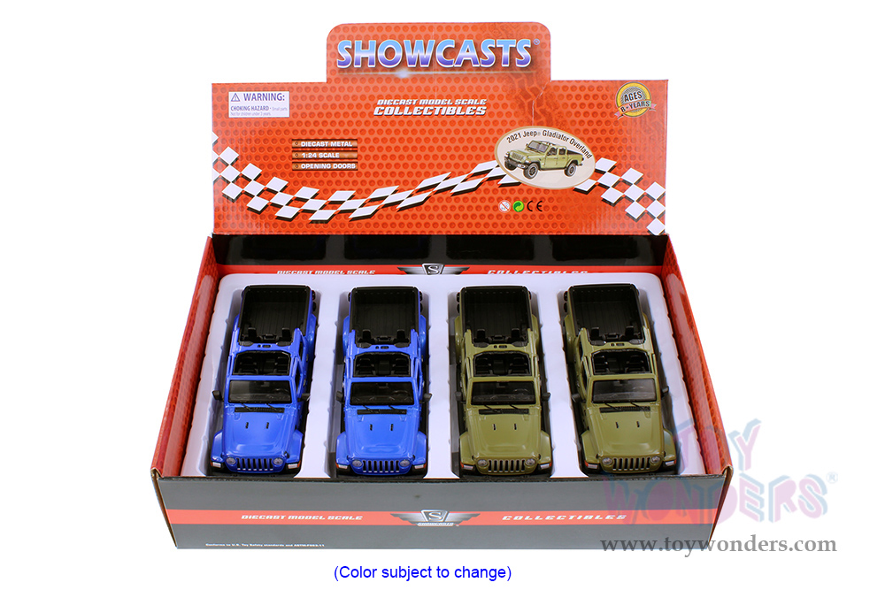 79367/16D Showcasts Collectibles - 2021 Jeep® Gladiator Overland Pickup Truck. 1:27 scale diecast collectible model car. This Jeep® Gladiator is an 8"L x 2.75"W x 2.75"H diecast metal car with freewheeling, openable doors. This 2021 Jeep® vehicle is manufactured by Motormax for Showcasts Collectibles. 4 pcs per display box in assorted colors.