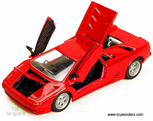 34903 Showcasts Collectibles - Lamborghini Diablo Hard Top. 1:24 scale diecast collectible model car. This Lamborghini Diablo is a 7.25"L x 3.25"W x 1.75"H die cast metal car with free wheeling, openable hood, doors & trunk. 4 pcs per display box in RED color. This Lamborghini Diablo is manufactured by Maisto for Showcasts Collectibles.