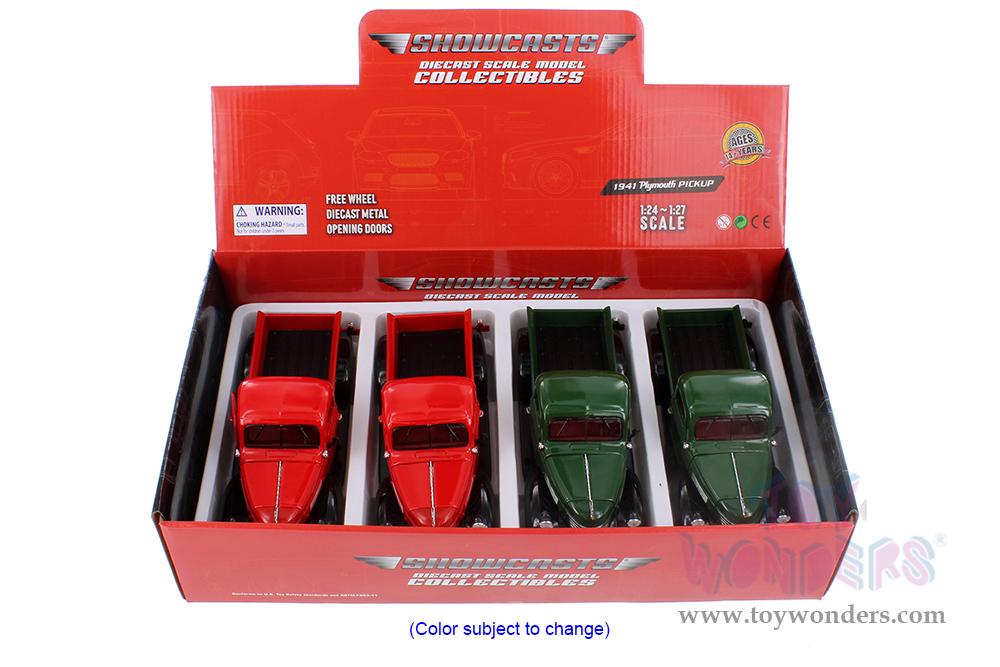 77278D Showcasts® Collectibles - 1941 Plymouth Pickup Truck. 1:24 scale diecast model car. This 1941 Plymouth is a 7.5"L x 3"W x 3"H diecast metal pickup truck with openable doors and hood, and workable steering. 4 pcs per display box. 77278D in assorted colors.