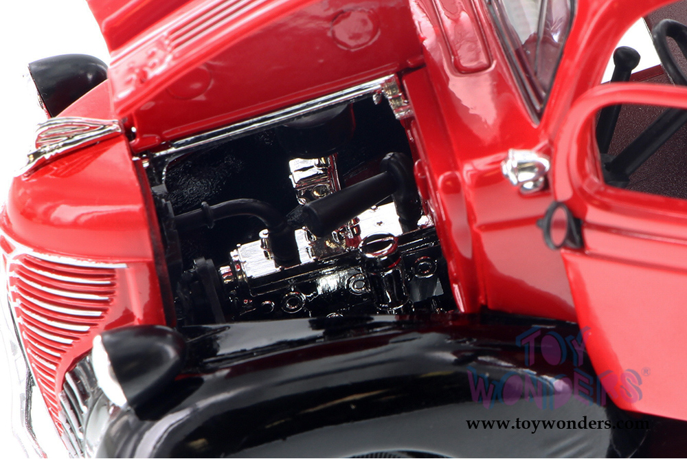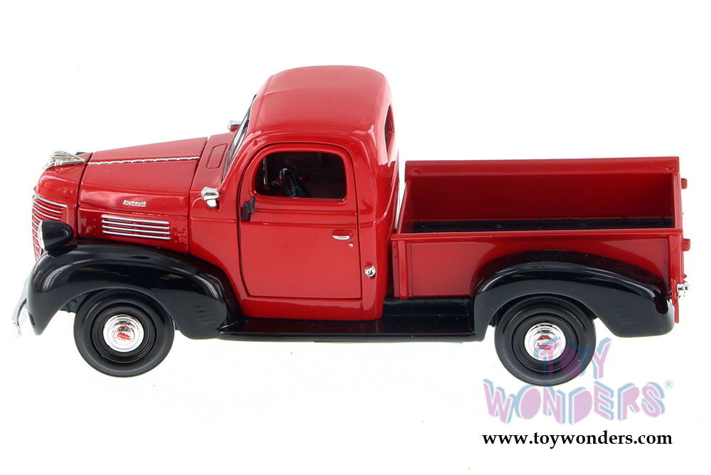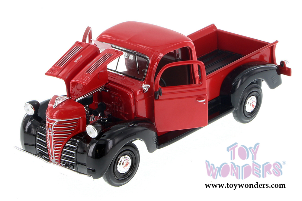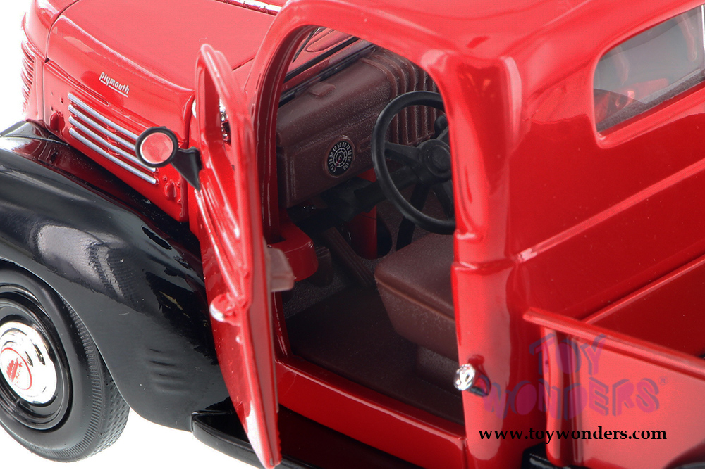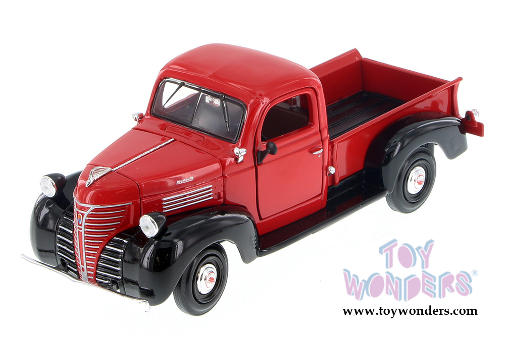73278/16D Showcasts Collectibles - 1941 Plymouth Pickup Truck. 1:24 scale diecast model car. This 1941 Plymouth is a 7.5"L x 3"W x 3"H diecast metal pickup truck with openable doors and hood, and workable steering. This 41 Plymouth pickup truck is manufactured by Motormax for Showcasts Collectibles. 4 pcs per display box. 73278/16D in assorted colors.