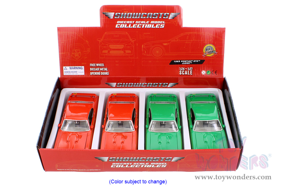 77242D Showcasts® Collectibles - 1969 Pontiac® GTO™ Judge™ Hardtop. 1:24 scale diecast collectible model car. This 1969 Pontiac GTO is an 8.5" long x 3"W x 2.25"H freewheeling with diecast metal. This 1969 Pontiac GTO is a classic muscle car with openable doors, hood and trunk, and workable steering. 4 pcs per display box. 77242D is in assorted colors. GM is a trademark of the General Motors Corporation.