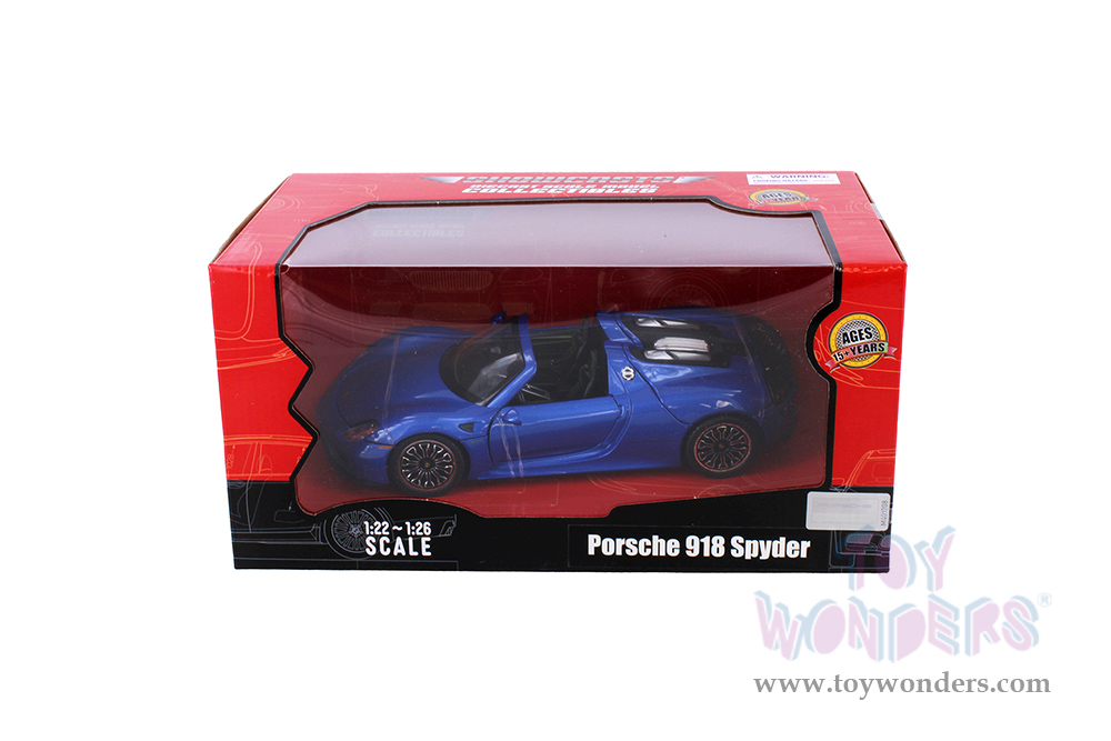 68243BU Showcasts® Collectibles - Porsche 918 Spyder. 1:24 scale diecast collectible model car. These Porsches are 7.5"L x 3"W x 2"H die-cast metal cars with freewheeling, steering wheel. Openable doors and hood. 68243BU is in blue. Individually packed in a window box. Box size: 9.75"Lx 5.25"Wx 4.75"H.