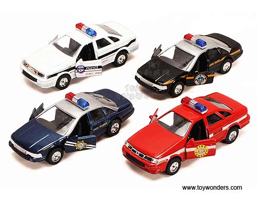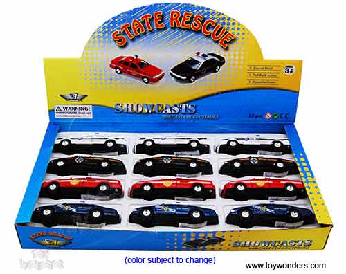 503D Showcasts Collectibles - State Rescue Team. This rescue car is 5"L x 1.75"W x 1.75"H diecast metal vehicle features openable doors and pullback motor action. 12 pcs per display box in assorted colors and styles (police, fire chief, state trooper & highway patrol.) 72 pcs per inner.