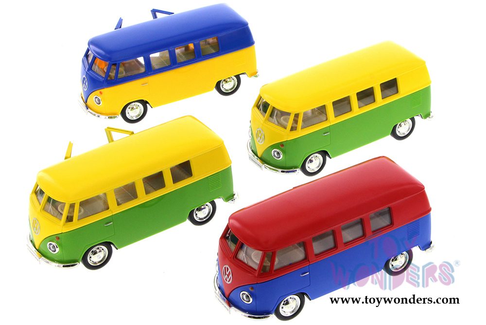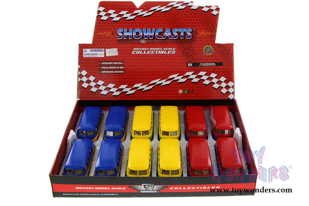555025M Showcasts Collectibles - Volkswagen Samba Bus. 1:32 scale diecast collectible model car. This 1962 VW Samba Bus is a 5"L x 2"W x 2.25"H long diecast metal classic with openable side doors & rear hatch. This Volkswagon also comes with pullback motor action . This 62 VW Bus is manufactured by Uni-Fortune for Showcasts Collectibles. 12 pcs per display box in assorted colors. 72 pcs per inner box.