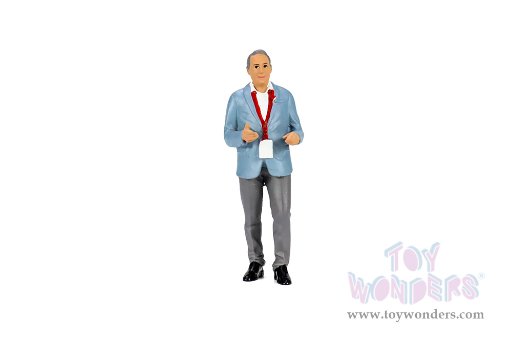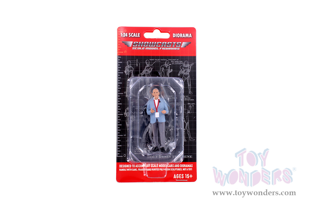 AD-24402 Showcasts® Figurines - On Air Figure 2. 1:24 scale male in a blue blazer and gray pants. Hand painted poly-resin material. This 3"H figure is great for decorating 1:24 scale cars and dioramas. Packed in a blister card. Card size: 4" x 7.5". 12 pcs. per inner. Note: Vehicle is not included.