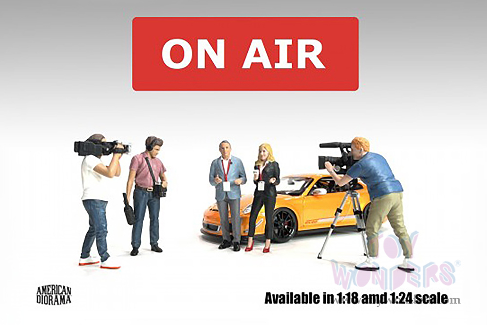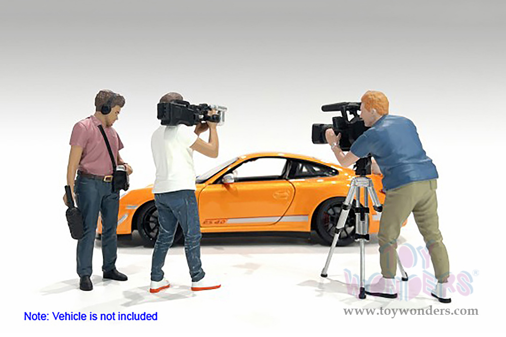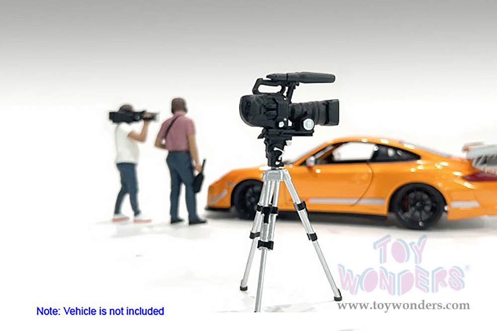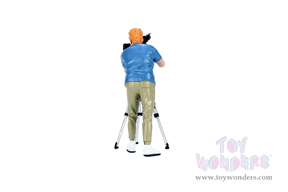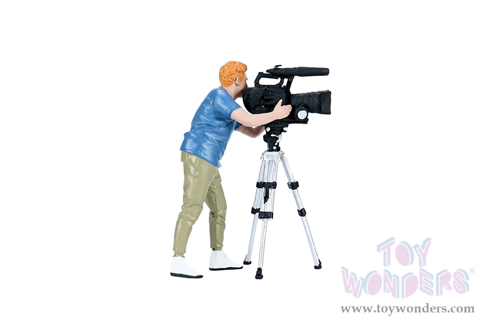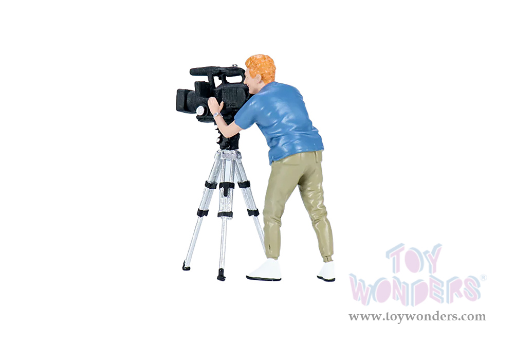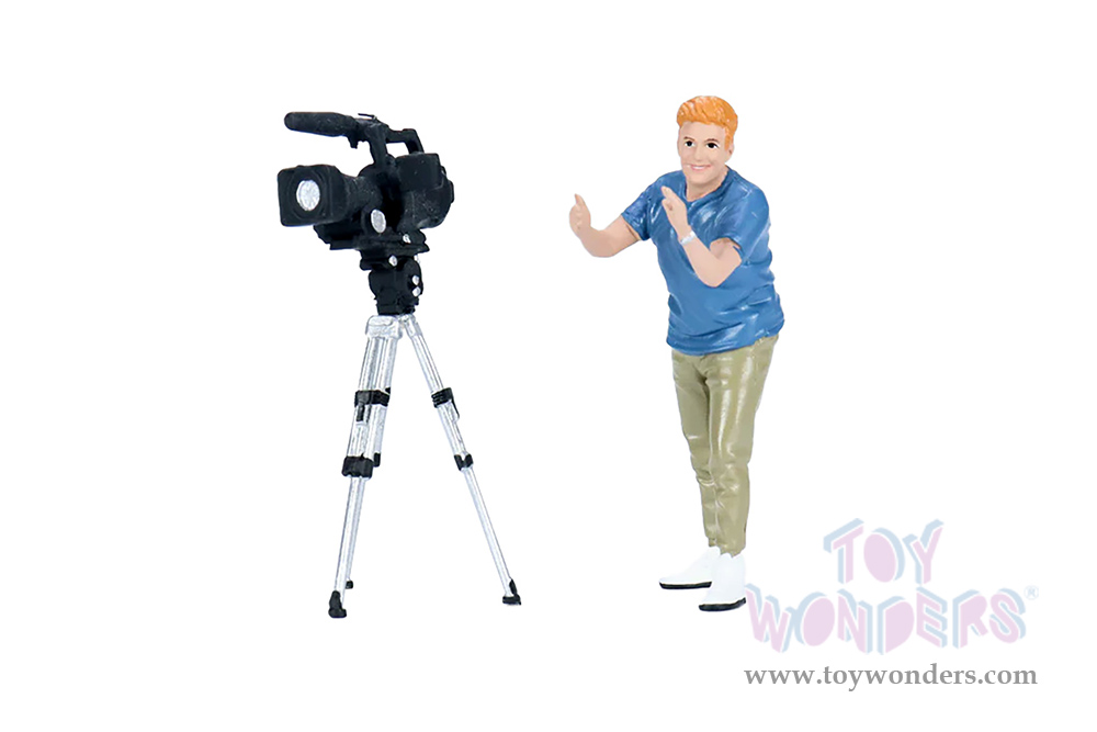 AD-18405 Showcasts® Figurines - On Air Figure 5 (2 pcs.) 1:18 scale male in a blue shirt and green pants. Hand painted poly-resin material. Camera accessory included. This 4"H figure is great for decorating 1:18 scale cars and dioramas. Packed in a blister card. Card size: 5" x 8.5". 12 pcs. per inner. Note: Vehicle is not included.