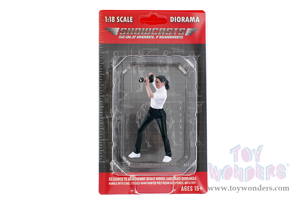 AD-19302 Showcasts® Figurines - "Photographers" Figure #2. 1:18 scale female in black pants and white turtle neck shirt. Hand painted poly-resin material. Only the figurine is included. This 3.75"H figure is great for decorating 1:18 scale cars and dioramas. Packed in a blister card. Card size: 5" x 8.5". 12 pcs. per inner. Note: Vehicle is not included.