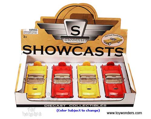 73215D Showcasts - 1956 Ford Thunderbird Convertible. 1:24 scale diecast collectible model car. This Ford Thunderbird is a 7.5"Lx 3"Wx 2"H die cast metal car with openable hood, doors & trunk. Free wheeling. The Ford Thunderbird is manufactured by Motor Max Toys for Showcasts. 4 pcs per display box in assorted colors. 16 pcs per inner box.