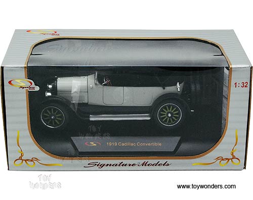 32363GY SIGNATURE MODELS - 1919 Cadillac Convertible. 1:32 scale diecast collectible model car. This Cadillac is a 5.5"L x 2"W x 2.25"H diecast metal car with openable hood and doors. Sits on a display plaque. This 1919 Cadillac is manufactured by Signature Models; ref. no. 32363GY is in GREY color. Individually packed in a window box. Window Box size: 8"L x 4.25"W x 3.75"H. GM is a trademark of the General Motors Corporation.