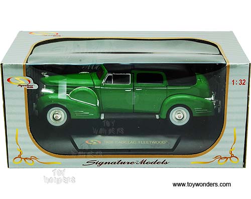 32340GN Signature Models - 1938 Cadillac Fleetwood. 1:32 scale diecast collectible model car. This 1938 Cadillac Fleetwood is a 6.25"L x 2"W x 1.75"H diecast classic car with adjustable front wheels, openable hood, doors, and trunk. Sits on a display plaque. This Cadillac Fleetwood is manufactured by Signature Models. 32340GN is in GREEN color. Individually packed in a window box. Window Box size: 8"L x 4.1"W x 3.6"H. GM is a trademark of the General Motors Corporation.