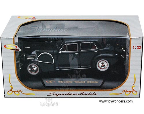 32361BK Signature Models - 1940 Cadillac Fleetwood 60 Special. 1:32 scale diecast collectible model car. This 1940 Cadillac Fleetwood 60 Special is a 6.25"Lx 2.25"Wx 2"H diecast classic oldies with openable hood, doors & trunk. Sits on a display plaque. This Cadillac Fleetwood 60 Special is manufactured by Signature Models. 32361 is in BLACK color. Individually packed in a window box. Box size: 8"L x 4"W x 3.5"H. GM is a trademark of the General Motors Corporation.