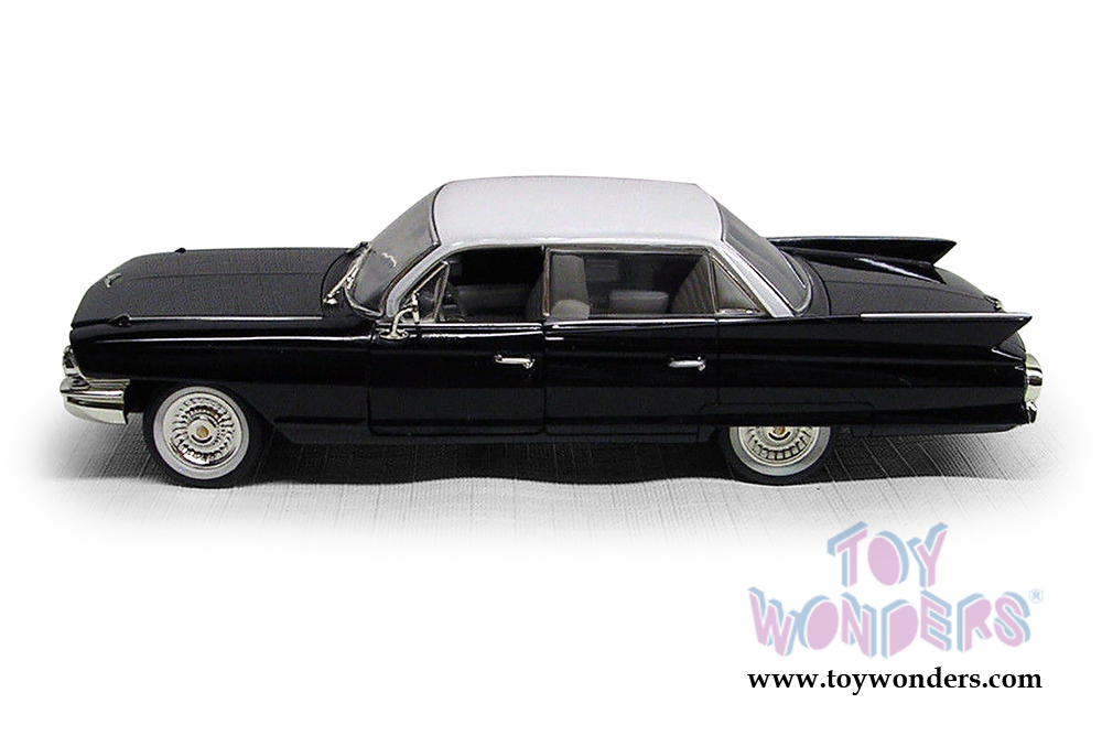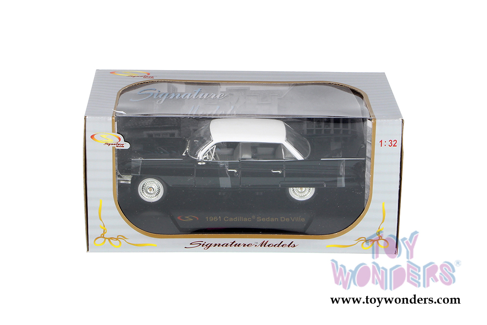 32362BLACK Signature Models - 1961 Cadillac Sedan DeVille Hardtop. 1:32 scale diecast collectible model car. This 1961 Cadillac Sedan DeVille is a 6.5"L x 2"W x 1.5"H diecast metal car with openable hood, doors, and trunk. Sits on a display plaque. This 1961 Cadillac Sedan DeVille is manufactured by Signature Models; ref. no. 32362BLACK is in BLACK with White roof. Individually packed in a window box. Window Box size: 8"L x 4"W x 3.5"H. GM is a trademark of the General Motors Corporation.