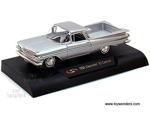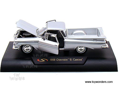 32438 Signature Models - 1959 Chevy El Camino Pickup Truck. 1:32 scale diecast collectible model car. This Chevrolet El Camino Pick-up is a 6.25"L x 2.25"W x 1.5"H diecast classic oldies with adjustable front wheels, openable hood, doors & tailgate. Sits on a display plaque. This Chevy Pick up is manufactured by Signature Models. 32438 is in SILVER color. Individually packed in a window box. Box size: 8"L x 4"W x 3.75"H. GM is a trademark of the General Motors Corporation.