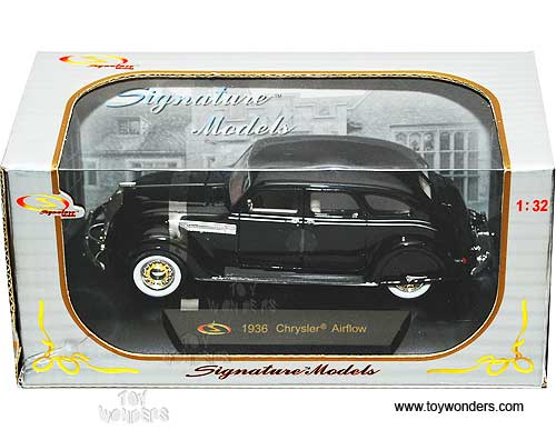 32306BK SIGNATURE MODELS - 1936 Chrysler Airflow Hard Top. 1:32 scale diecast collectible model car. This 1936 Chrysler Airflow is a 6"Lx 2.25"Wx 1.75"H diecast classic oldies with adjustable front wheels and openable hood & doors. Sits on a display plaque. This 1936 Chrysler Airflow is manufactured by Signature Models; ref. no. 32306 in BLACK color. Individually packed in a window box.