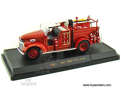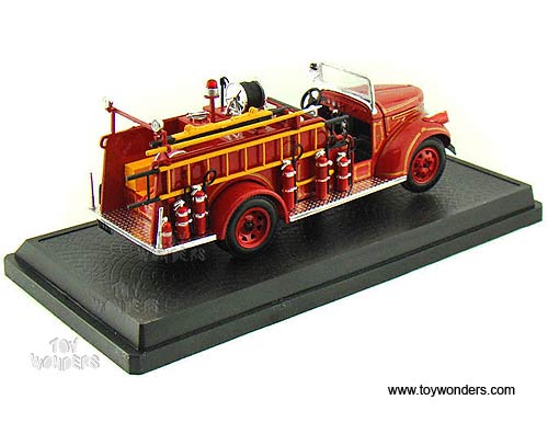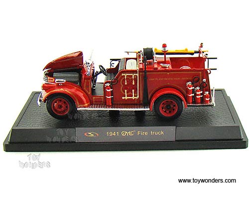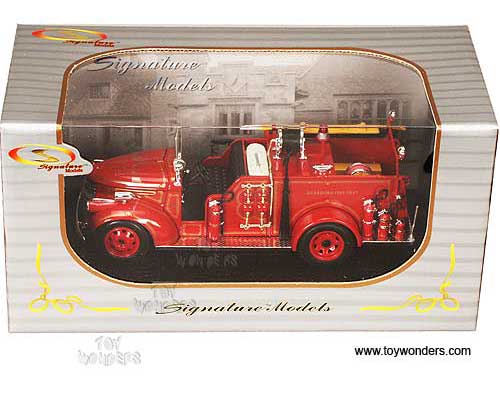 32348R Signature Models - 1941 GMC Fire Truck Dearboro Fire Dept. 1:32 scale diecast model car. This GMC Fire Engine is a 6.25"L x 2"W x 2.5"H diecast metal with openable hood. Sits on a display plaque. This GMC Fire Truck is manufactured by Signature Models. 32348R is in RED color. Individually packed in a window box. Box size: 9"L x 4.5"W x 4.5"H.