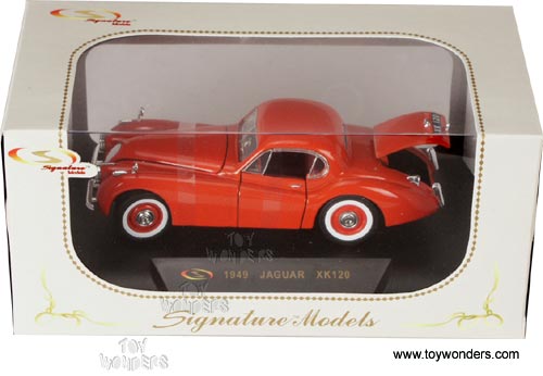 32303OR SIGNATURE 1949 Jaguar XK120. 1:32 scale diecast collectible model car. Car is 5.5"Lx 2"Wx 1.75"H. Diecast classic oldies with adjustable front wheels, openable hood, doors & truck. Sits on a display plaque. Signature Models. 32303 in ORANGE color. Individually packed in a window box.