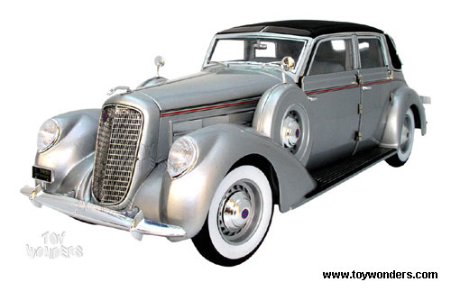 18127SV SIGNATURE MODELS - 1937 Lincoln Touring Cabriolet. 1:18 scale diecast collectible model car. This 1937 Lincoln Touring Cabriolet is an 11.75"L x 3.25"W x 3.75"H diecast metal classic oldies with highly detailed engine & interior and openable doors, hood & trunk. Sits on a display platform. This 37 Lincoln is manufactured by Signature Models. 18127 in SILVER color. Individually packed in a window box.