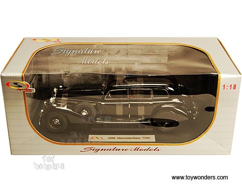 18129 SIGNATURE MODELS - 1938 Mercedes Benz 770K Hard Top. 1:18 scale diecast collectible model car. This Mercedes-Benz 770-K is an 11.5" long die cast oldies luxury car with openable doors, hood & trunk, mounted on removable base, display window box. This 1938 Benz is manufactured by Signature Models; ref. no. 18129 in BLACK color.
