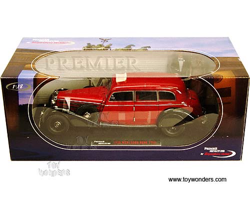 38203 Signature Models Premier Miniature - 1938 Mercedes-Benz 770K with Two Figures. 1:18 scale diecast collectible model car. This Mercedes-Benz 770K is an 11.75'L x 4"W x 3.5"H die cast metal oldies car with openable doors, hood & trunk. Sits on a display platform. This 1938 Mercedes Benz 770K is manufactured by Signature Models. Item 38203 is in BURGUNDY color. Individually packed in a window box. Box size: 15.75"L x 7.75"W x 6.25"H.