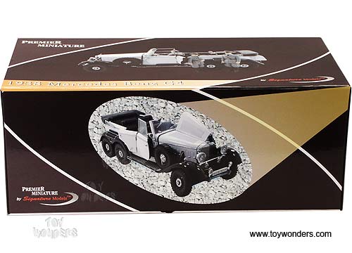 38202W Signature Models Premier Miniature - 1938 Mercedes-Benz G4 Convertible with Three Figures. 1:18 scale diecast collectible model car. This Mercedes Benz G-4 is an 11.5'L x 3.75"W x 3.25"H die cast metal oldies car with openable doors & hood. This 1938 Mercedes-Benz G4 is manufactured by Signature Models. Item 38202 is in WHITE color. Individually packed in a box. Box size: 14.25"L x 7"W x 5.75"H.