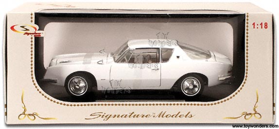18101W SIGNATURE MODELS 1963 Studebaker Avanti. 1:18 scale. 10.25" die cast classic car, opening doors/hood/trunk, soft top. Mounted on display platform. 18101 WHITE color. Individually packed in a window box.