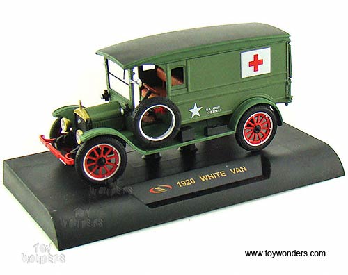 32520GN Signature Models - 1920 White Van. 1:32 scale diecast collectible model car. This White Van is a 6"Lx 2.25"Wx 2.75"H die cast classic oldies with adjustable front wheels, openable hood & doors. Sits on a display plaque. The White Van is manufactured by Signature Models. 32520 in GREEN color. Individually packed in a window box.