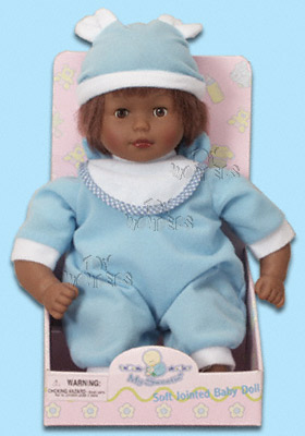 91232B Soft Baby Doll (Black). 30cm soft black baby doll in blue outfit w/ bib & hat. Eyes that open & shut. Box size: 6"Lx5.5"Wx11.5"H.