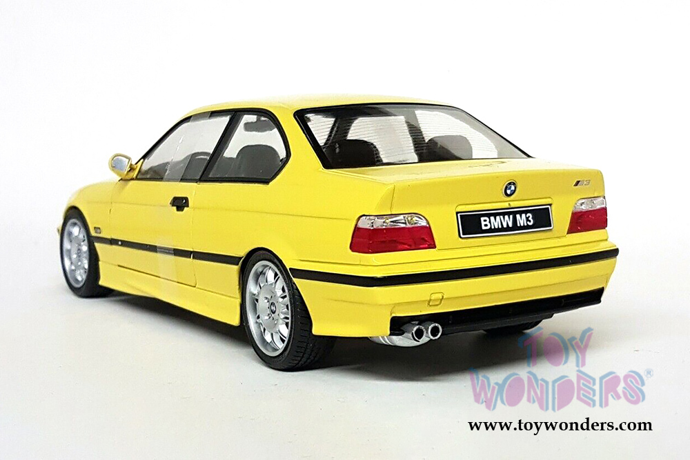 S1803902 Solido - 1990 BMW E30 Coupe M3. 1:18 scale diecast collectible model car. This BMW is a 9"L x 3.25"W x 3"H diecast metal car with directional wheels and openable doors. Model comes attached to a stand. Each individually packed in a window box. Window Box size is 12.25"L x 6"W x 5.5"H. S1803902 is in YELLOW. This BMW is manufactured by Solido.