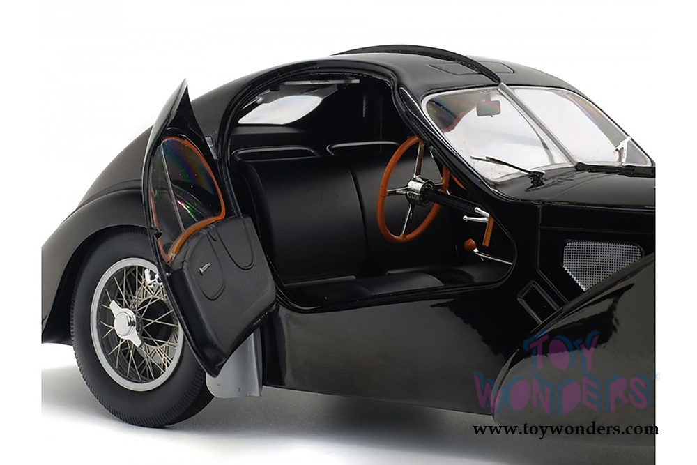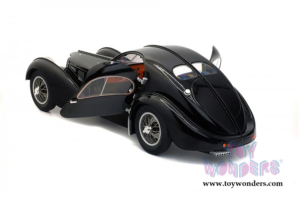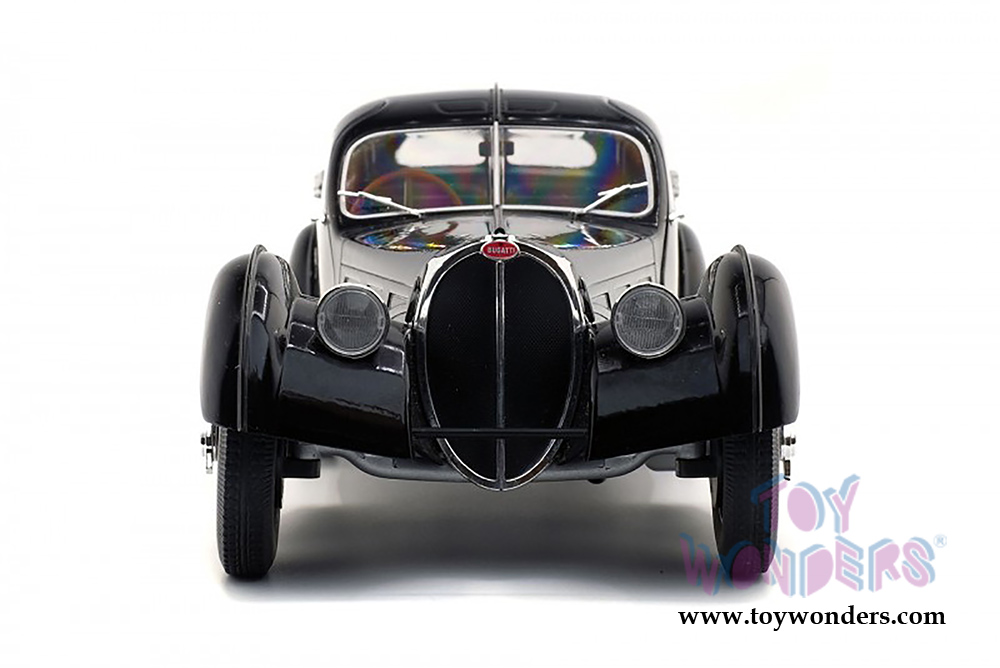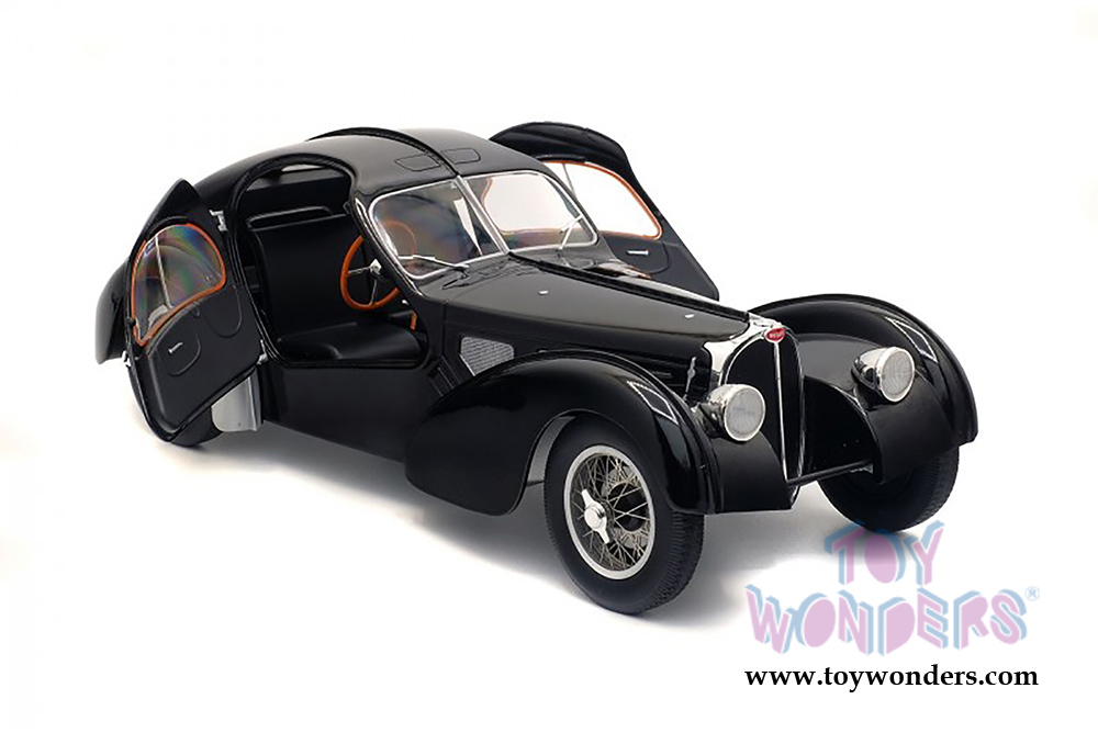 S1802101 Solido - 1937 Bugatti Type 57 SC Atlantic Hardtop. 1:18 scale diecast collectible model car. This Bugatti is a 10"Lx 3.5"Wx 3"H diecast metal car with directional wheels and openable doors. Model comes attached to a stand. Each individually packed in a window box. Window Box size is 12.25"Lx 6"Wx 5.5"H. S1802101 is in black. This Bugatti is manufactured by Solido.