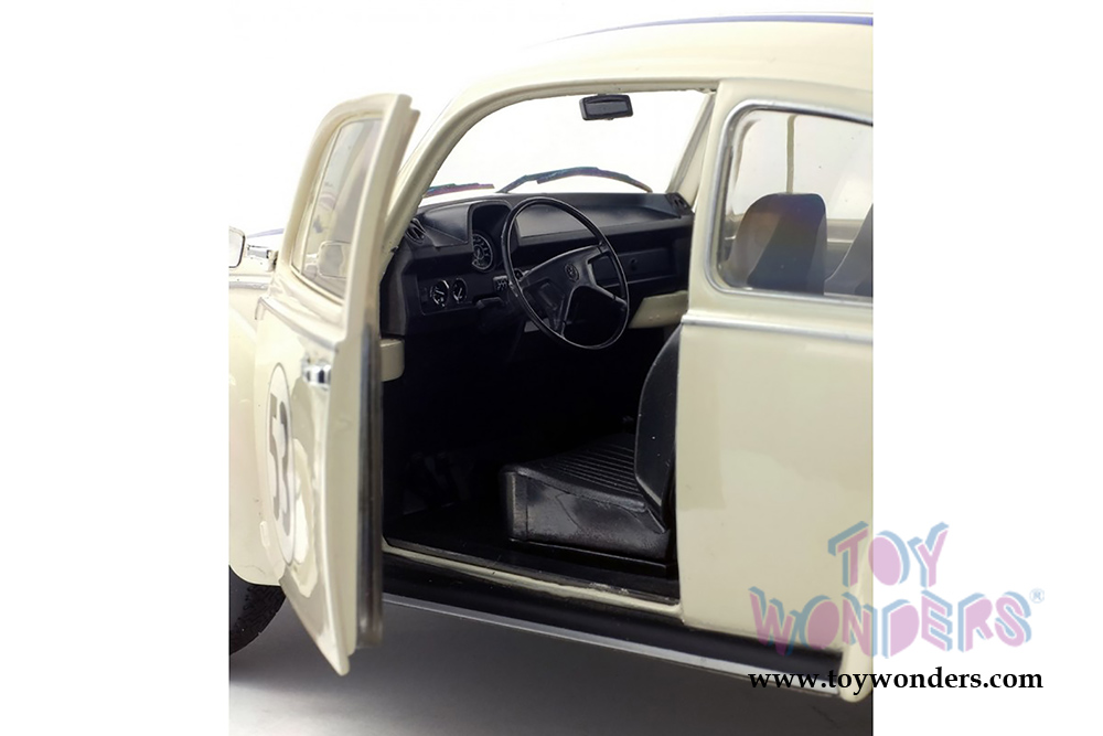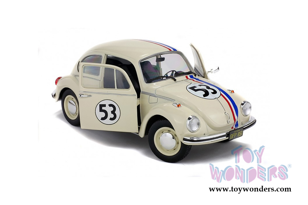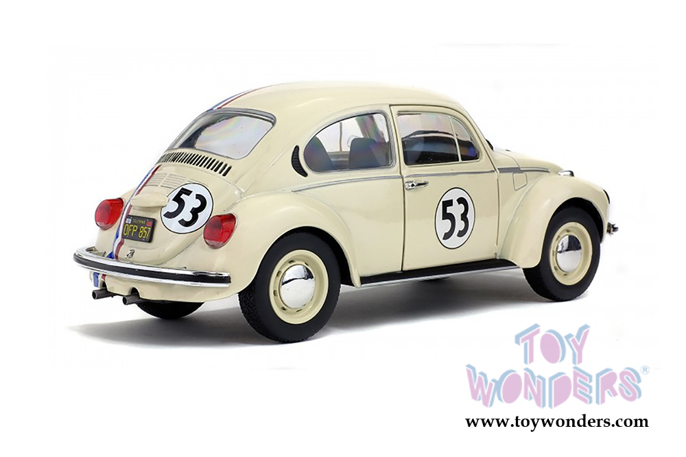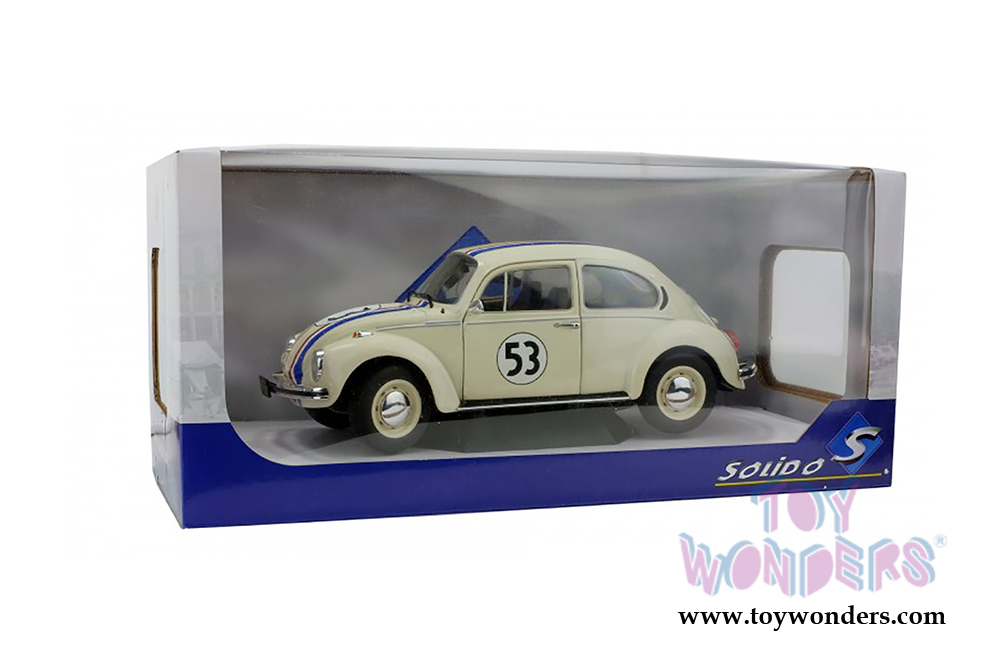 S1800505 Solido - 1973 Volkswagen Beetle 1303 Racer #53 Hardtop. 1:18 scale diecast collectible model car. This VW Beetle is an 8.5"L x 3.25"W x 3"H diecast metal car with directional wheels and openable doors. Model comes attached to a stand. Each individually packed in a window box. Window Box size is 12.25"L x 6"W x 5.5"H. S1800505 is in CREAM color. This VW Beetle is manufactured by Solido. Limited edition to 1500 pcs.