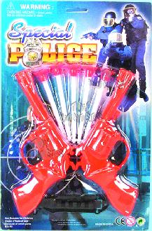 1976/2 Special Police Dart Gun Set. Two 7.5" long, neon color guns that shoot soft darts. Blister card size: 8.5"x13". 12 pcs/inner. Dollar item.