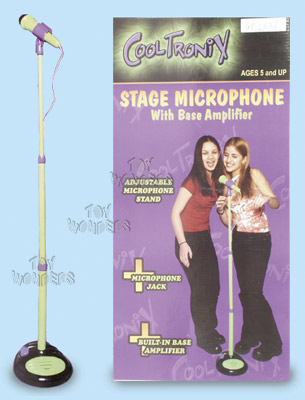628S Stage Microphone with Base Amplifier. Microphone on a stand with adjustable height (21" to 45" tall). Microphone can be detached and held. Amplifier in base has volume control, microphone input jack, and music input jack. Uses 4 "C" batteries (not included). Box is 9"W x 18.5"H x 3.75"D. Assorted colors.
