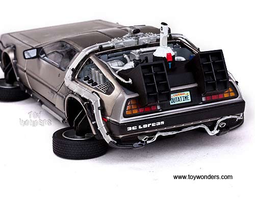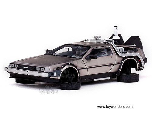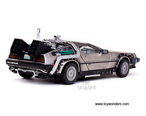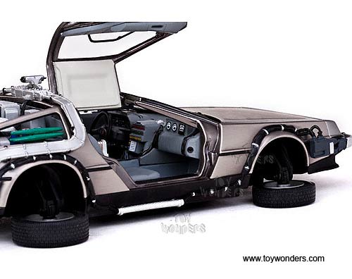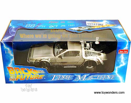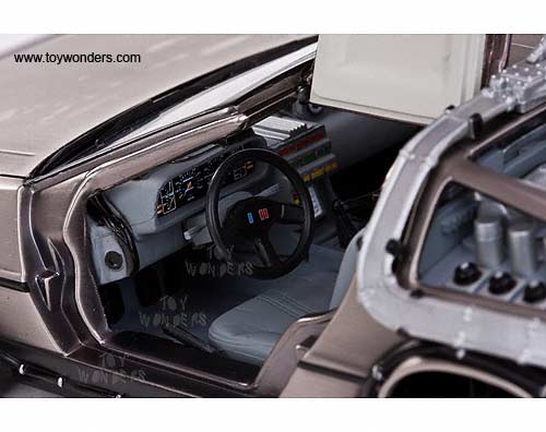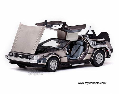 2710 SUNSTAR - 1981 Back to the Future DeLorean DMC 12 Coupe. 1:18 scale diecast collectible model car. 9.75"L futuristic car from the hit movie Back to the Future time machine car. Opening split wing doors, hood, and flip-out wheels for hovering. This DeLorean is manufactured by Sun Star. 2710 in STAINLESS STEEL FINISH color. Individually packed in a window box. SS2710