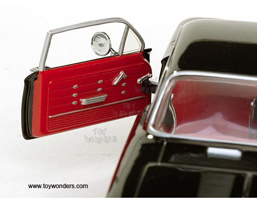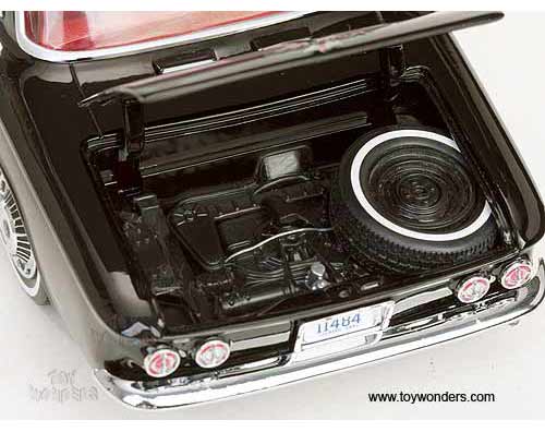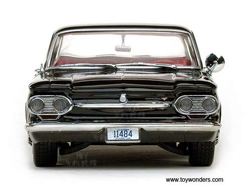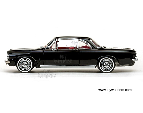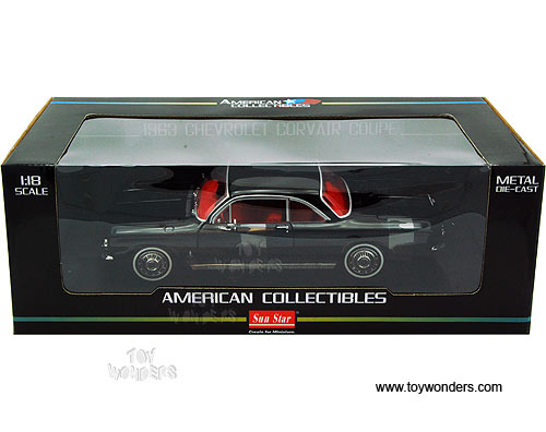 1484 Sun Star - 1963 Chevrolet Corvair Coupe Hard Top. 1:18 scale diecast collectible model car. This Chevy Corvair Coupe is 10"L x 3.5"W x 2.75"H with openable doors & trunk. Turnable front wheels. Mounted on a display stand. This 1963 Chevrolet Corvair Coupe is manufactured by Sunstar. 1484 is in TUXEDO BLACK color. Individually packed in a window box. Box size: 14"L x 6.5"W x 5"H.