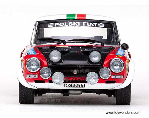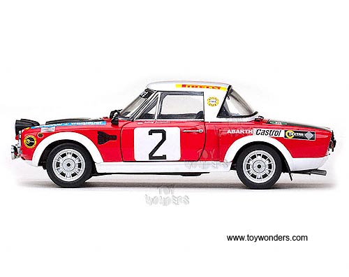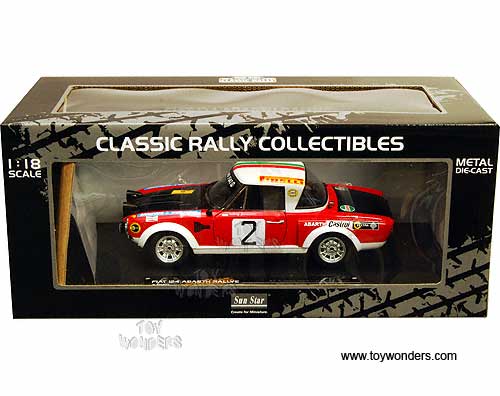 4950 Sun Star Classic Rally - Fiat 124 Abarth Race Car A.Jaroszewicz / R.Zyszkowski #2 (Winners Rally Warszawski 1975). 1:18 scale diecast collectible model car. This Fiat 124 Abarth Rallye racing car is an 8.5"L x 3.75"W x 2.75"H die-cast metal car with openable doors, hood & trunk. Mounted on a display stand. Classic Rally collectibles. This Fiat 124 Abarth is manufactured by Sunstar. Individually packed in a window box. Box size: 14"L x 6.5"W x 5.75"H. Item 4950 is in RED color with Black hood & trunk, and White roof. Sponsored by Sandudo Wallpaper, Firelli, Castrol, and more. Limited edition 1 of 559 pcs.