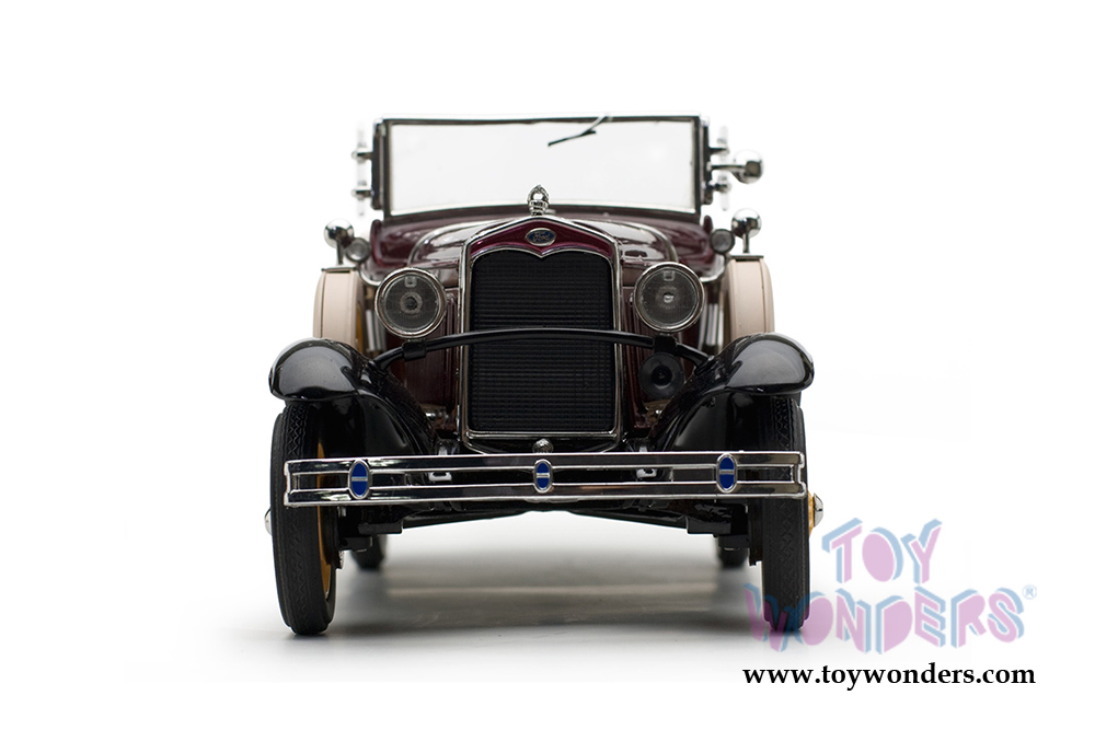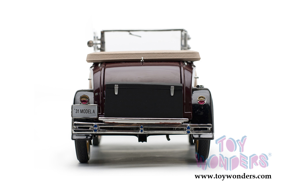 6124M Sun Star Ford Classic - 1931 Ford Model A Roadster. 1:18 scale diecast model car. This Ford is an 8.5"L x 3.75"W x 3.25"H diecast metal with freewheeling, steerable front wheels, opening bi-fold hood and doors. Detailed four-cylinder engine. Side wind vanes pivot. Detailed interior, exterior and engine compartment. The 1931 Ford Model A is manufactured by Sun Star. Item 6124M is in Ford MAROON color. Individually packed in a box. Box size: 12.25"L x 6.5"W x 6.25"H.