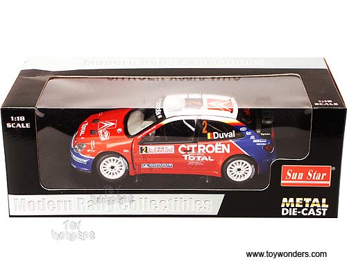 4415 Sun Star Modern Rally - Citroen Xsara WRC F.Duval / S.Prevot #2 (Rallye Monte-Carlo 2005). 1:18 scale diecast collectible model car. This Citroen Xsara WRC racing car is an 8.75"L x 3.5"W x 3"H die-cast metal car with openable doors & hood. Turnable front wheels, steering function, detailed interior, engine & chassis. Mounted on a display stand. Sponsors inlclude Michelin, Total, Recaro, and more. Modern Rally collectibles. This Citroen Xsara WRC is manufactured by Sunstar. Individually packed in a window box. Box size: 14.25"L x 6.5"W x 5"H.