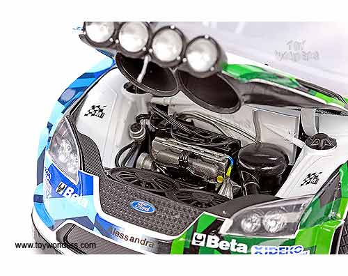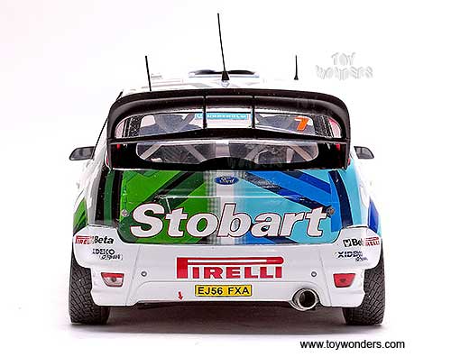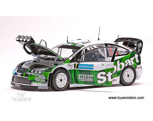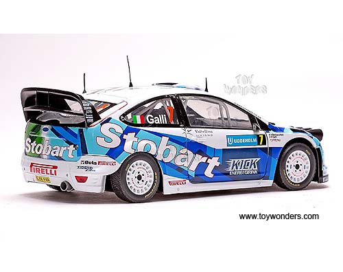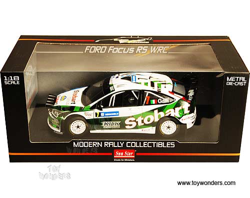 3938GN Sun Star Modern Rally - Ford Focus RS WRC07 Race Car G.Galli/ G.Bernacchini #7 (3rd Swedish Rally 2008). 1:18 scale diecast collectible model car. This Ford Focus RS WRC07 racing car is a 9.25"L x 3.5"W x 2.75"H die-cast metal car with openable doors & hood. Turnable front wheels, steering function, detailed interior, engine & chassis. Mounted on a display stand. Modern Rally collectibles. This Ford Focus RS WRC07 is manufactured by Sunstar. Individually packed in a window box. Box size: 14"L x 6.5"W x 6"H.