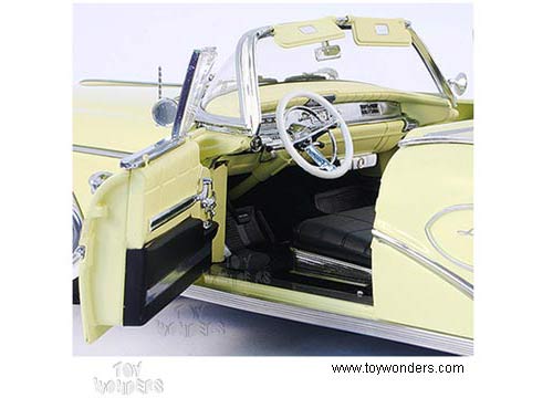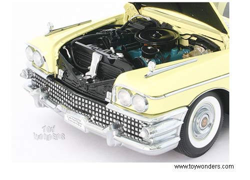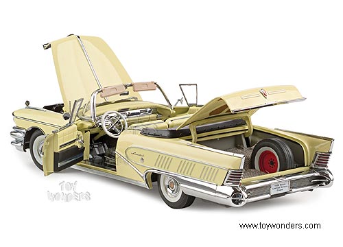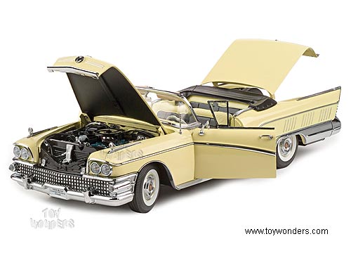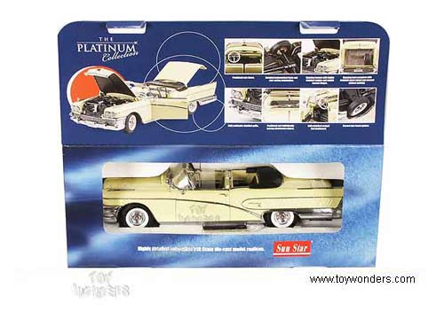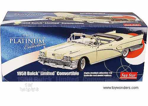 4811CM SUN STAR Platinum Collection - 1958 Buick Limited Convertible. 1:18 scale diecast collectible model car. This Buick is a 12" long die cast metal car with openable hood, doors & trunk. This 1958 Buick is manufactured by SunStar. 4811 in CASINO CREAM color (like yellow). Individually packed in a box. Box size: 14.75"Lx 6.8"Wx 6"H.