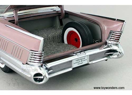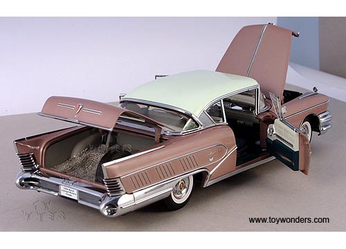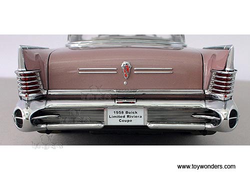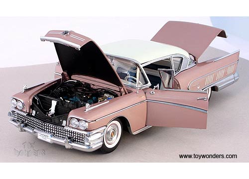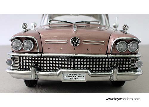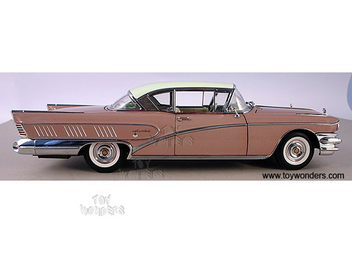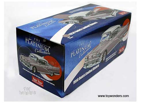 4801PR SUN STAR Platinum Collection - 1958 Buick Limited Coupe. 1:18 scale diecast collectible model car. This Buick is a 12" long die cast metal car with openable hood, doors & trunk. The Buick is manufactured by SunStar. 4801 in LAUREL MIST (like purple) color with Polar mist (like beige) Roof . Individually packed in a window box. Box size: 14.75"Lx 6.8"Wx 6"H. GM is a trademark of the General Motors Corporation.