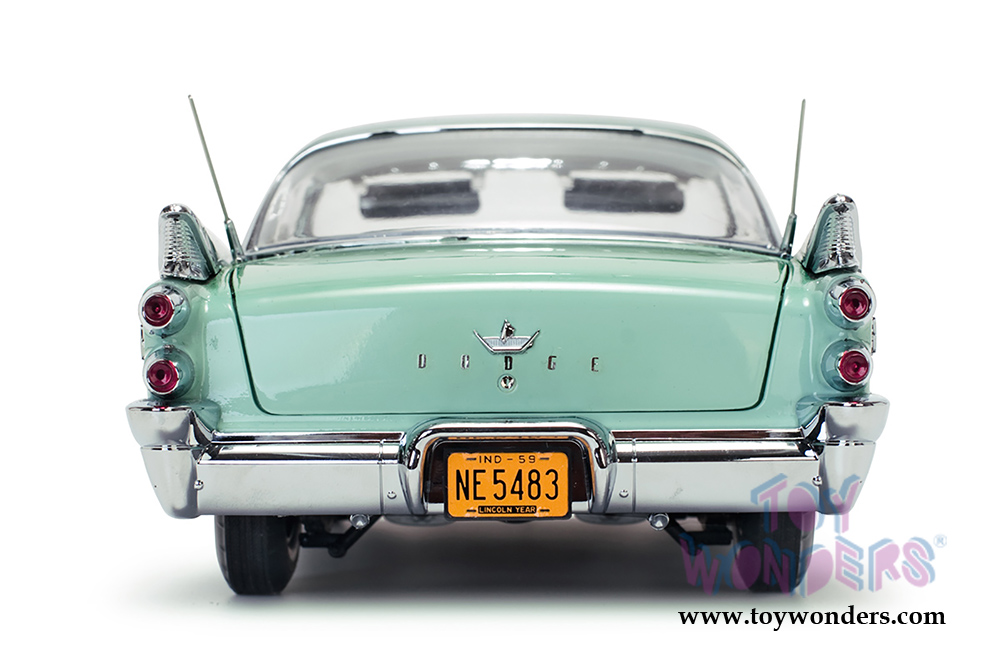 5483 Sun Star Platinum - 1959 Dodge Custom Royal Lancer Hardtop. 1:18 scale diecast collectible model car. This Dodge Custom Royal Lancer is about 12" L diecast metal car with openable hood, doors, and trunk. The '59 Dodge Custom Royal Lancer is manufactured by SunStar. Item 5483 is in Jade Poly (Aquamarine) color. Individually packed in a box. Box size: 14.75"Lx 6.75"Wx 6"H.
