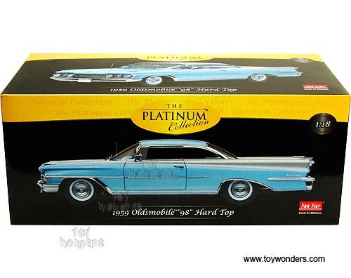 5242 Sun Star Platinum - 1959 Oldsmobile "98" Hard Top. 1:18 scale diecast collectible model car. This Olds "98" is about 12" long die cast metal car with openable hood, doors & trunk. Manufactured by SunStar. 5242 is in FROST BLUE & WHITE 2-tone colors. Individually packed in a box. Box size: 14.5"Lx 6.75"Wx 6"H. GM is a trademark of the General Motors Corporation.
