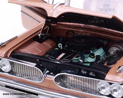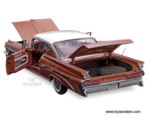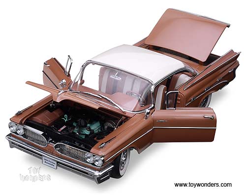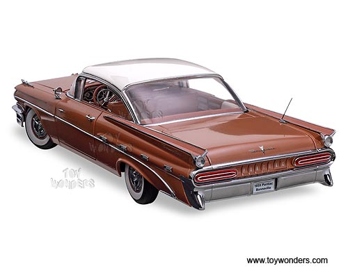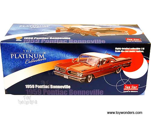 5171 SUN STAR Platinum Collection - 1959 Pontiac Bonneville Hard top. 1:18 scale diecast collectible model car. This Pontiac Bonneville is approximately 12" long die cast metal car with openable hood, doors & trunk. This 1959 Pontiac Bonneville is manufactured by SunStar. 5171 is in CANYON COPPER color with Ivory roof. Individually packed in a window box. Box size: 1 5"Lx 6.8"Wx 6"H. GM is a trademark of the General Motors Corporation.