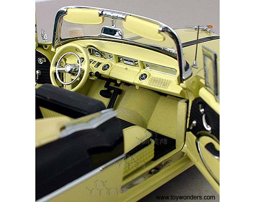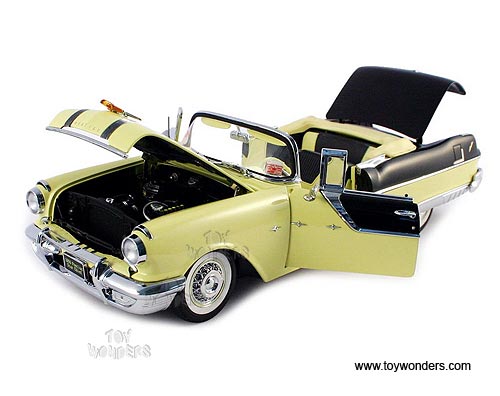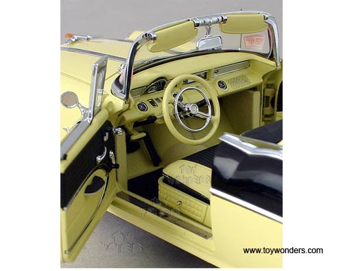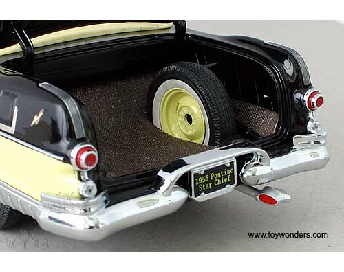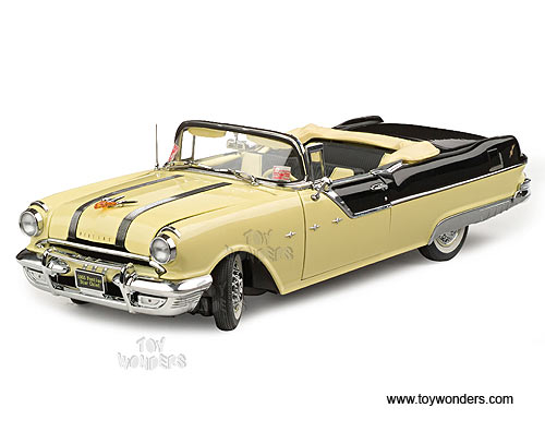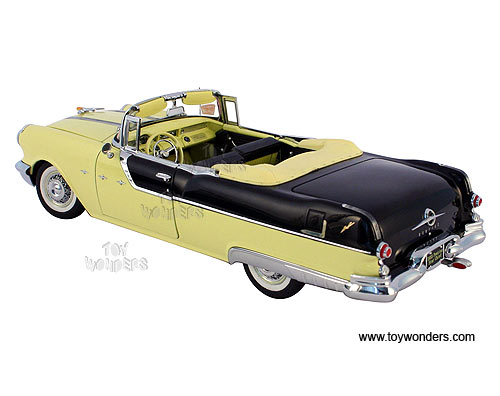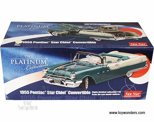 5052 SUN STAR Platinum Collection - 1955 Pontiac Star Chief Convertible. 1:18 scale diecast collectible model car. This Pontiac is an 11" long die cast metal car with openable hood, doors & trunk. Detailed engine & detailed independent front and rear spring suspension. The Pontiac is manufactured by SunStar. 5052 is in AVALON YELLOW color with RAVEN BLACK trunk. Individually packed in a window box. Box size: 14.5"Lx 6.8"Wx 6"H.